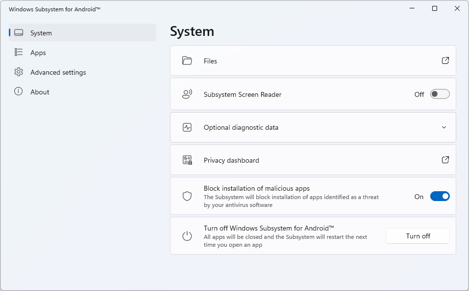 Here you will find various settings, including the option to 'Turn off' the Subsystem.